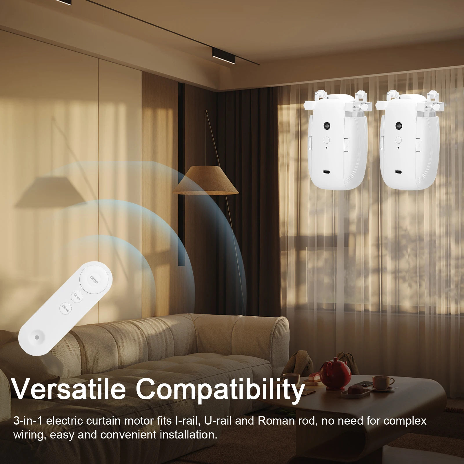 Compatibilidade versátil: O motor de cortina elétrica 3 em 1 se encaixa no trilho I, trilho U e haste romana, sem necessidade de fiação complexa, instalação fácil e conveniente.